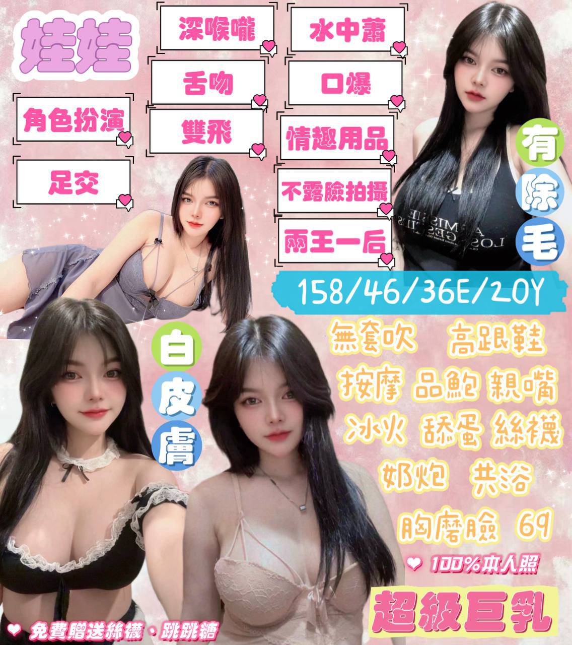 無套吹/奶泡/按摩/品鮑/69/親嘴/舔蛋/共浴/高跟鞋/胸膜臉/絲襪/🉑️深喉嚨/🉑️水中蕭/🉑️自慰秀/🉑️舌吻/🉑️可接入珠/🉑️角色扮演/🉑️口爆/🉑️足交/🉑️情趣用品/🉑️雙飛/🉑️不露臉拍攝🉑️/🉑️吞精