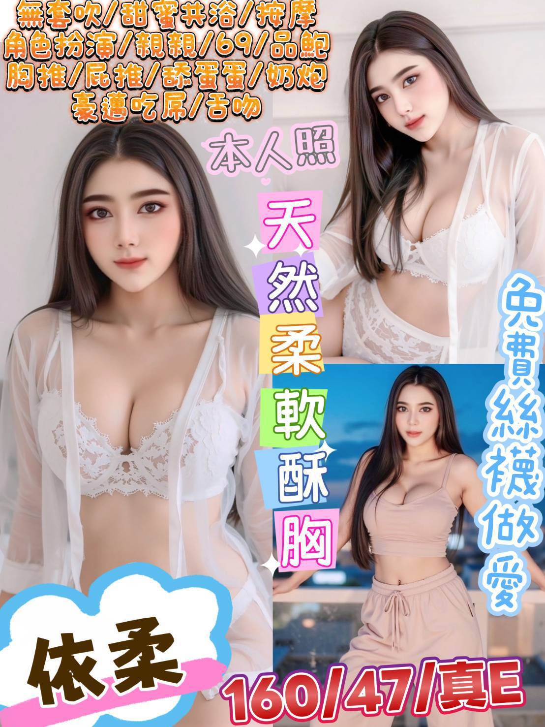 無套吹 共浴 親嘴 舌吻視感覺 品鮑 69 按摩 胸推 屁推 奶炮 自慰秀 角色扮演 絲襪(客自備 情趣用品(客自備