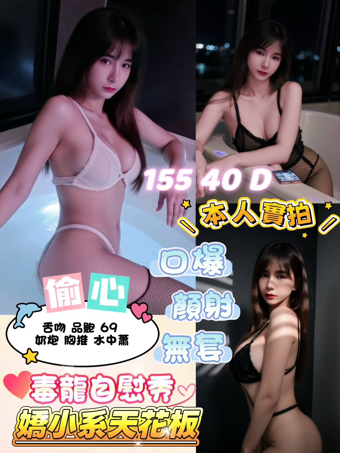 無套吹 共浴 小親親 舌吻視感覺 深喉嚨 品鮑 69 舔蛋 胸磨臉 按摩 奶炮 雙龍 胸推 屁推 艷舞 絲襪(客自備 情趣用品(客自備