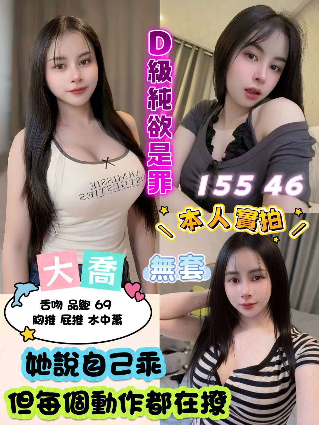 無套吹>小親親>品鮑69>親胸>奶炮>足交>簡易按摩>絲襪誘惑(客自備)